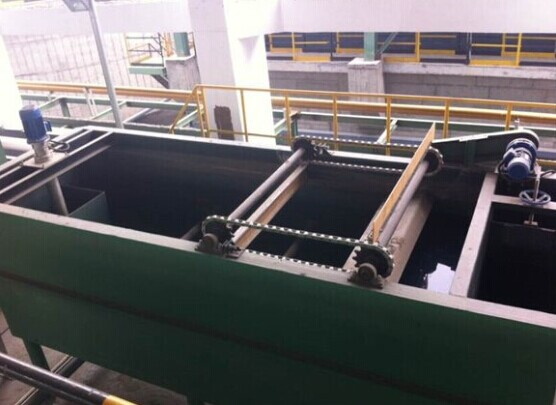 渦凹氣浮稱為旋切氣浮,渦凹氣浮機是一種主要用于去除工業或城市污水中的油脂、膠狀物及固體懸浮物而設計的污水處理設備。系統主要由曝氣裝置、刮渣裝置和排渣裝置組成,其中曝氣裝置主要是渦凹曝氣機,刮渣裝置主要由刮渣機和牽引鏈條組成,排渣裝置主要為螺旋推進器,如下圖所示。工作時,溶氣設備由電機帶動高速旋轉(旋